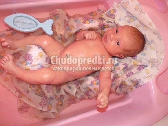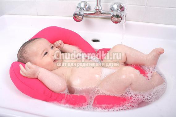 Для начала малыша нужно положить на руку так, чтобы его головка находилась у вас в легковой яме, а попка в районе ладони. Не стоит усердно намывать маленького ребенка, ни в коем случае не беритесь за мочалки. Кожа малыша еще очень нежная и мягкая. Вы можете вызвать стирание кожи, опрелости и т. д. Поэтому просто опустите его в воду по шейку, слегка погладьте ладошкой, пройдитесь по складочкам. Первое купание не должно занимать более 5 минут. Вынув ребенка из воды, положите его на заранее приготовленную пеленку. Не забывайте, что муж все это время должен находиться рядом и помогать вам.